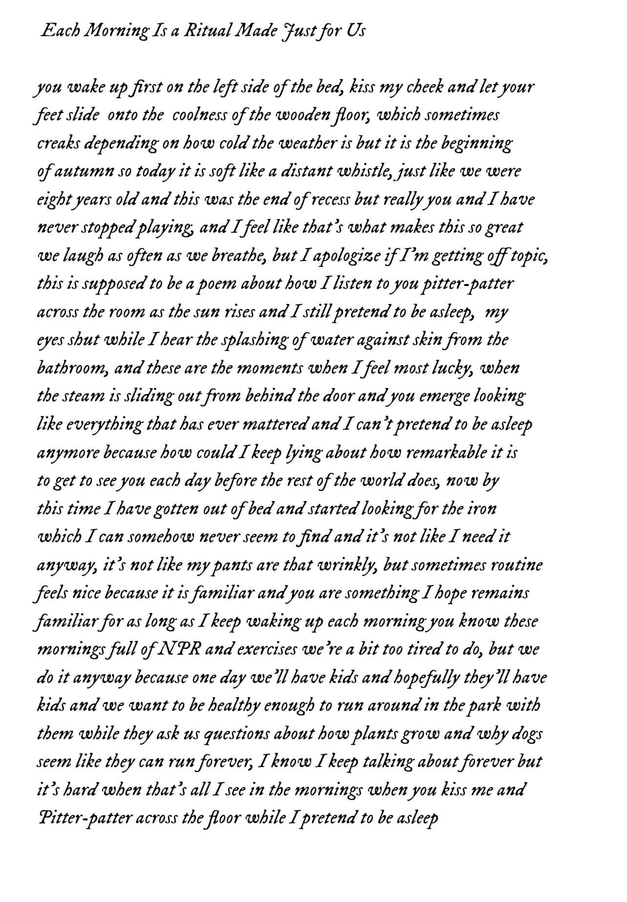 With the repetitive use of “you” in the first stanza, Lisa introduces the rest of this character’s daily possibilities. They are either annoyed at their day or their job, while they are talking to the person on the other end of the phone. Then Lisa throws in her first little piece of complexity. The poem’s character has taken for granted the small things life gives them, like waking up in the morning, “when suddenly” they utter a single world that changes their entire life. However, while looking at all the changes the character realizes something: the houses that surround them contain “a world formed while [their] back was turned.”
