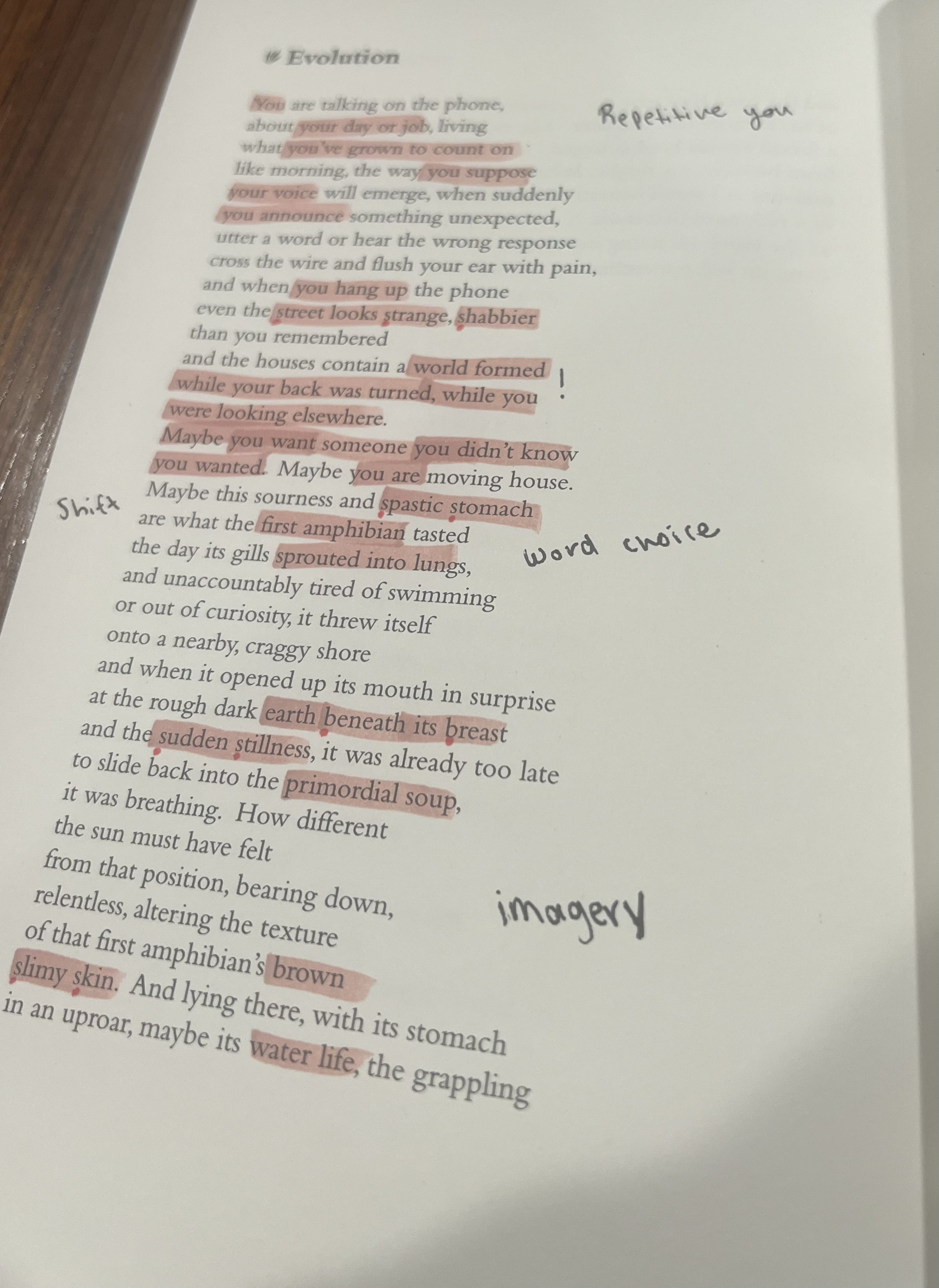 The first and final shift of this poem is the introduction of the “spastic stomach” suffered by the first amphibian that sprouted gills to breathe for the first time. With this shift, Lisa introduces the idea of actual evolution to her poem. She details the experience for the amphibian through imagery and her thoughts on what he might have felt. And she ends by stating that his life before could now be characterized to him as “a kind of drowning.”